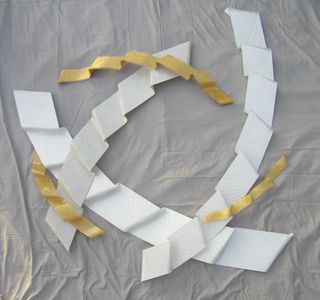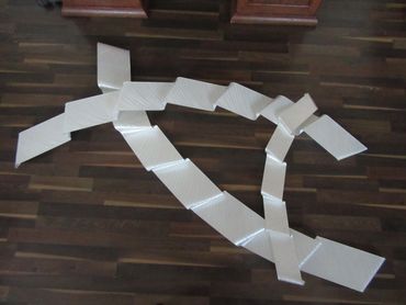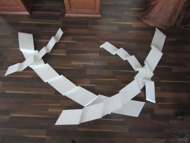 I then make a couple of templates of the placement of the ribbons on a sheet of plastic to show the client. At the client's wall space-- I again lay them out horizontally on a clean floor surface in the figuration to show them. If they like that, I'll put the templates up on the wall and they can choose one.