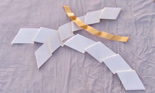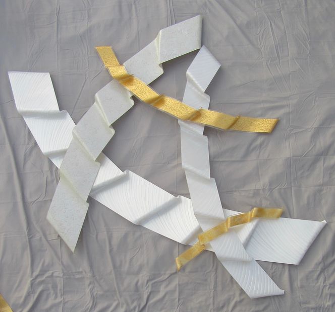 First the client's wall is measured, and a couple of mock ups of the ribbons are created to fit the space by laying them out at my studio where I can photograph them and send photos to the client.